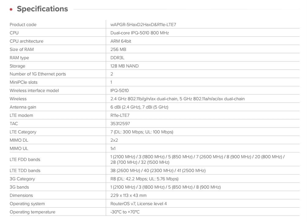 Sada wAP ax LTE7 přináší rychlé a spolehlivé Wi-Fi 6 do vaší venkovské chaty nebo jakéhokoli jiného náročného prostředí – například venkovské čerpací stanice nebo autobusové zastávky. Odolný design wAP díky své jednoduchosti a odolnosti zůstává oblíbeným produktem mezi uživateli MikroTik. Aktualizovaný kryt ještě více zvyšuje odolnost a pro větší bezpečnost je vybaven skrytým antivandalským šroubem za logem MikroTik. Nyní přichází vylepšen o modem CAT7 LTE s dvojnásobnou rychlostí nahrávání a výkonnější platformu ARM. Výkonné dvoupásmové rádio s duálním řetězcem (2x2 MIMO) zajišťuje silné bezdrátové pokrytí v celém vašem domě, na zahradě nebo v obchodních prostorách. Integrované antény s vyšším ziskem a přepracovaným systémem LTE pro ještě lepší kvalitu signálu, vyšší dosah a lepší stabilitu v náročných prostředích. Proč upgradovat na CAT7? • Dvojnásobná rychlost nahrávání (v závislosti na infrastruktuře LTE vysílačů a dalších proměnných) • Rozšířená podpora frekvencí, včetně pásma 28 (700 MHz) a pásma 32 (1500 MHz) pro lepší výkon v exponovaných oblastech • Agregace nosných (2×CA) pro vyšší účinnost a odezvu v rušných sítích • Stejný osvědčený design – žádné změny v instalaci nebo konfiguraci • Nižší náklady – lepší konektivita Vylepšený hardware s jednoduchou správou Tento kompaktní přístupový bod je vybaven moderním dvoujádrovým procesorem ARM a běží na systému RouterOS v7, což zajišťuje stabilní připojení k internetu a vynikající výkon VPN. wAP ax LTE7 kit také podporuje nový systém CAPsMAN pro snadnou centralizovanou správu více zařízení pouhými několika kliknutími. Zařízení je vybaveno dvěma gigabitovými ethernetovými porty, z nichž jeden má PoE-in pro flexibilní možnosti napájení. Lze také použít standardní DC konektor. Nenápadný design – odolný proti povětrnostním vlivům a vandalismu wAP ax LTE7 je navržena tak, aby zapadla do jakéhokoli prostředí. Její jednoduchý, elegantní design nepřitahuje nežádoucí pozornost, takže je ideální i pro rušná veřejná prostranství. wAP lze bezpečně připevnit k jakékoli vnější stěně nebo střeše zevnitř pouzdra. Vyznačené prohlubně na zadní straně krytu označují místo pro vrtání otvoru pro průchod kabelu, což umožňuje diskrétní a bezpečné montáž na stěnu. Technické specifikace: Product code: wAPGR-5HaxD2HaxD&R11e-LTE7 CPU: Dual-core IPQ-5010 800 MHz CPU architecture: ARM 64bit Size of RAM: 256 MB RAM type: DDR3L Storage 128 MB NAND Number of 1G Ethernet ports: 2 MiniPCIe slots: 1 Wireless interface model: IPQ-5010 Wireless: 2.4 GHz 802.11b/g/n/ax dual-chain, 5 GHz 802.11a/n/ac/ax dual-chain Antenna gain: 6 dBi (2.4 GHz), 7 dBi (5 GHz) LTE modem: R11e-LTE7 TAC: 35312597 LTE Category: 7 (DL: 300 Mbps; UL: 100 Mbps) MIMO DL: 2x2 MIMO UL: 1x1 LTE FDD bands: 1 (2100 MHz) / 3 (1800 MHz) / 5 (850 MHz) / 7 (2600 MHz) / 8 (900 MHz) / 20 (800 MHz) / 28 (700 MHz) / 32 (1500 MHz) LTE TDD bands: 38 (2600 MHz) / 40 (2300 MHz) / 41 (2500 MHz) 3G Category: R8 (DL: 42.2 Mbps; UL: 5.76 Mbps) 3G bands: 1 (2100 MHz) / 3 (1800 MHz) / 5 (850 MHz) / 8 (900 MHz) Dimensions: 229 x 113 x 43 mm Operating system: RouterOS v7, License level 4 Operating temperature: -30°C to +70°C Napájení: Number of DC inputs: 2 (DC-jack, PoE-In) DC-jack input Voltage: 12-57 V PoE-In input Voltage: 18-57 V Power adapter nominal voltage: 24 V Power adapter nominal current: 0.8 A PoE-in: 802.3af/at Max power consumption: 13 W.