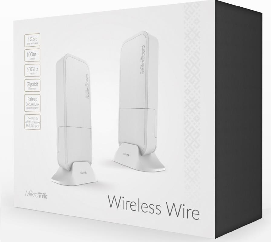 RBwAPG-60ad je revolučnou novinkou v sortimente MikroTik, ktorá zaujme každého, kto buduje spoje na krátke vzdialenosti. RBwAPG-60ad je kompletné bezlicenčné spojenie v pásme 60 GHz, ktoré pracuje so štandardom 802.11ad, ktorý v reálnej prevádzke umožňuje priepustnosť až 1000 Mb/s Full Duplex na vzdialenosť do 100 m. RouterBoard je ako vždy vybavený veľmi obľúbeným operačným systémom RouterOS s licenciou L3. Ak chcete upgradovať jednu z jednotiek na prístupový bod, stačí si zakúpiť licenciu L4.