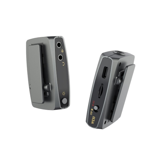 Vysielač v sade WE10 je vybavený vysoko výkonným všesmeryovým mikrofonom. K dispozícii je aj malý externý klopový mikrofón, ktorý ľahko pripojíte k vysielaču pomocou 3,5 mm jack konektora a ponúka tak väčšiu voľnosť pri nahrávaní. Na zadnej strane vysielača je svorka, vďaka ktorej ho môžete ľahko pripnúť napríklad na klopu, nohavice alebo opasok. Prijímač jednoducho upevníte na hornú časť fotoaparátu do kolébky blesku alebo ho pripojíte na iné zvolené nahrávacie zariadenie (kamera, počítač, audio rekordér atď.). Vybrané zariadenie prepojíte pomocou 3,5 mm jack konektora a priloženého audio kábla.