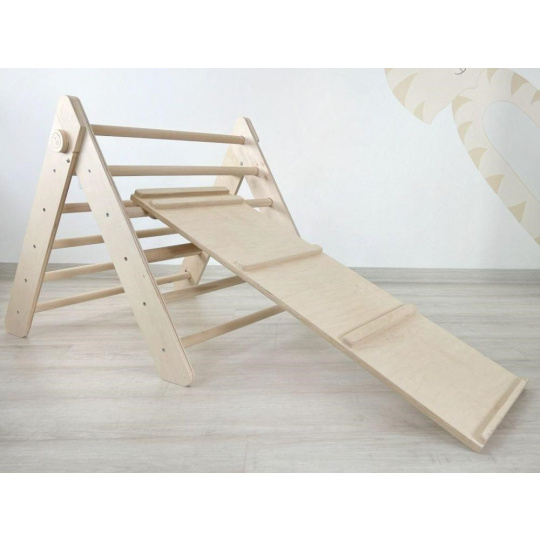 Montessori Piklerov trojuholník ponúka deťom možnosť pohybovej realizácie podľa vlastných schopností a odvahy. Deti sa úplne prirodzene naučia rozoznať a rešpektovať svoje možnosti a mieru odváhy, zároveň ich obratnosť bude stále rásť. Schodík má bezpečnú výšku, príslušenstvo je akurát široké pre pohodlné držanie a navyše je vybavené systémom proti otáčaniu príčníkov.