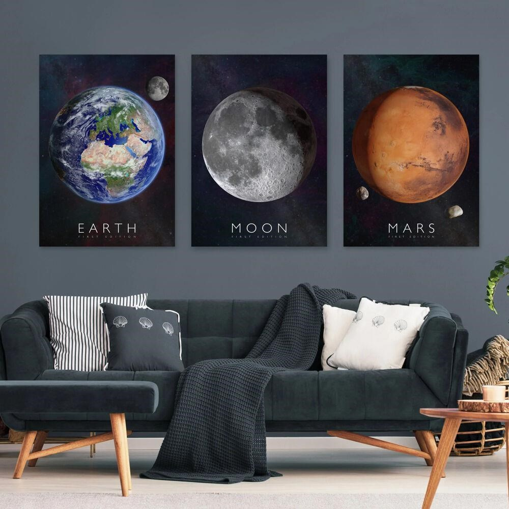 Balenie obsahuje 3 plagáty: Zem, Mesiac a Mars. Plagáty sú tlačené na odolnom papieri vo veľkosti A1 (594 × 841 mm).