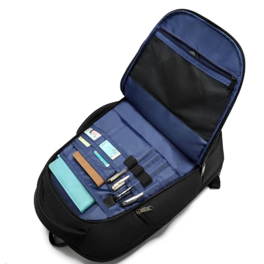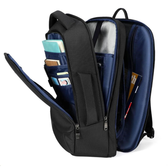 MYBALO ASTON Perfektní volba pro minimalisty s dobrým vkusem  6 ikon: - Nejtenčí batoh - Elegantní - Kapsa na notebook do 15,6" - Kapsa na tablet do 9" - Otevírání o 180 stupňů - USB a USB-C port - Drží tvar - Voděodolný - Skryté kapsy  Elegantní a minimalistický Jedná se o velmi elegantní a minimalistický batoh. S tímto parťákem neuděláte chybu při běžném nošení do města, ani na důležité schůzce.  Tenký batoh MYBALO Aston je batoh s vůbec nejmenší hloubkou z naší nabídky. Díky tomu působí elegantně a minimalisticky, ale i přesto se do něj vejdou všechny vaše nezbytnosti.  Kvalitní voděodolný materiál, dlouhá životnost Kvalitní umělá kůže zajišťuje trvanlivost a odolnost batohu proti vodě a opotřebení. MYBALO Aston tak bude vaším společníkem opravdu dlouho.  Drží tvar Batoh si zachovává svůj tvar také v případě, že jej budete mít úplně prázdný.  Vestavěný USB a USB-C port Nabíjejte svá elektronická zařízení kdekoli a kdykoli díky vestavěnému USB a USB-C portu.  Popruh k uchycení na kufr Cestujte pohodlně. Kdykoli chcete mít volná záda, jednoduše připevněte batoh na rukojeť svého kufru.  Pohodlné polstrování Užijte si komfortní nošení díky kvalitnímu a prodyšnému polstrování ramenních popruhů a zádové části.  Další praktické kapsy Zorganizujte si pohodlně a snadno své věci díky množství vychytaných kapes.  Skryté kapsy V zádové části a na ramenním popruhu najdete skryté kapsy pro bezpečné uložení cenností.  Vnitřní kapsy Vnitřní kapsy slouží pro snadnou organizaci všech vašich věcí.  Přední kapsa Přední kapsa je určena pro věci, které chcete mít rychle a snadno po ruce.  Parametry: - Rozměry: 46 x 30 x 9 cm - Objem: 11 l - Hmotnost: 1,19 kg - Kapsa na notebook: Ano (do vel. 15,6") - Kapsa na tablet: Ano (do vel. 9") - USB port: Ano - Voděodolnost: Ano - Hlavní materiál: Ekokůže + Polyester - Podšívka: Polyester - Barva: Černá