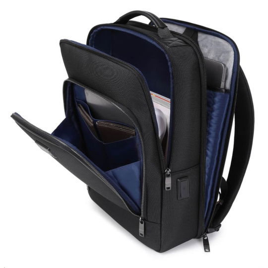 MYBALO ASTON Perfektní volba pro minimalisty s dobrým vkusem 6 ikon: - Nejtenčí batoh - Elegantní - Kapsa na notebook do 15,6" - Kapsa na tablet do 9" - Otevírání o 180 stupňů - USB a USB-C port - Drží tvar - Voděodolný - Skryté kapsy Elegantní a minimalistický Jedná se o velmi elegantní a minimalistický batoh. S tímto parťákem neuděláte chybu při běžném nošení do města, ani na důležité schůzce. Tenký batoh MYBALO Aston je batoh s vůbec nejmenší hloubkou z naší nabídky. Díky tomu působí elegantně a minimalisticky, ale i přesto se do něj vejdou všechny vaše nezbytnosti. Kvalitní voděodolný materiál, dlouhá životnost Kvalitní umělá kůže zajišťuje trvanlivost a odolnost batohu proti vodě a opotřebení. MYBALO Aston tak bude vaším společníkem opravdu dlouho. Drží tvar Batoh si zachovává svůj tvar také v případě, že jej budete mít úplně prázdný. Vestavěný USB a USB-C port Nabíjejte svá elektronická zařízení kdekoli a kdykoli díky vestavěnému USB a USB-C portu. Popruh k uchycení na kufr Cestujte pohodlně. Kdykoli chcete mít volná záda, jednoduše připevněte batoh na rukojeť svého kufru. Pohodlné polstrování Užijte si komfortní nošení díky kvalitnímu a prodyšnému polstrování ramenních popruhů a zádové části. Další praktické kapsy Zorganizujte si pohodlně a snadno své věci díky množství vychytaných kapes. Skryté kapsy V zádové části a na ramenním popruhu najdete skryté kapsy pro bezpečné uložení cenností. Vnitřní kapsy Vnitřní kapsy slouží pro snadnou organizaci všech vašich věcí. Přední kapsa Přední kapsa je určena pro věci, které chcete mít rychle a snadno po ruce. Parametry: - Rozměry: 46 x 30 x 9 cm - Objem: 11 l - Hmotnost: 1,19 kg - Kapsa na notebook: Ano (do vel. 15,6") - Kapsa na tablet: Ano (do vel. 9") - USB port: Ano - Voděodolnost: Ano - Hlavní materiál: Ekokůže + Polyester - Podšívka: Polyester - Barva: Černá.