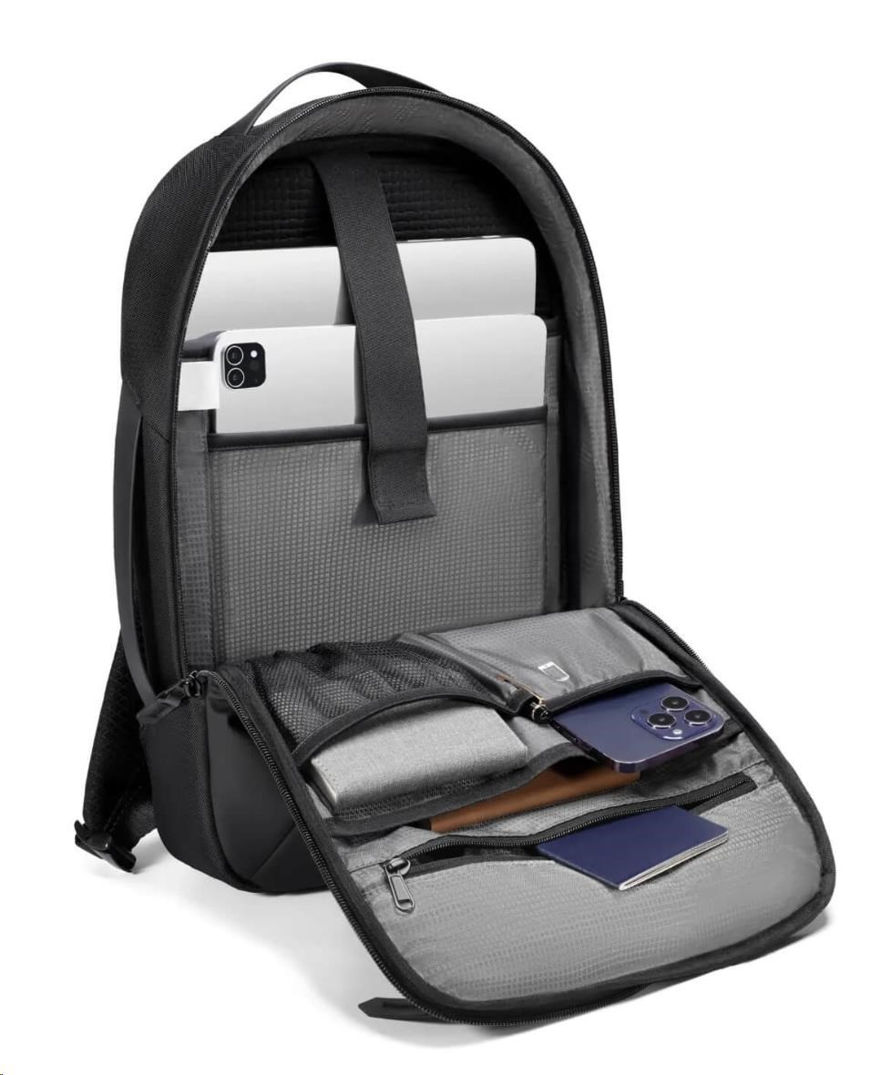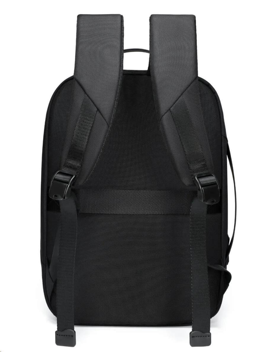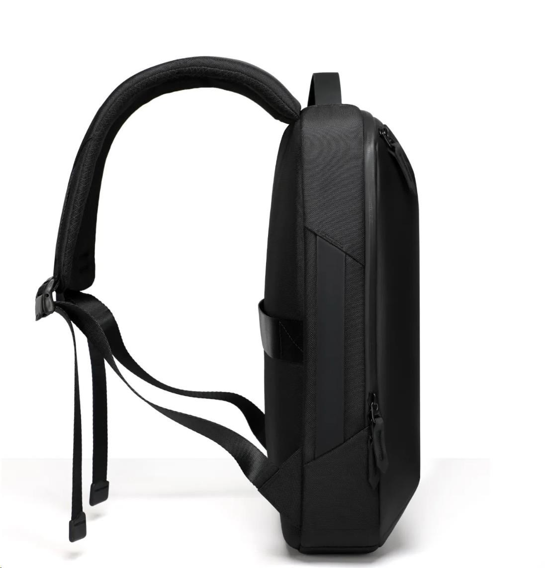 MYBALO ASTON Perfektní volba pro minimalisty s dobrým vkusem  6 ikon: - Nejtenčí batoh - Elegantní - Kapsa na notebook do 15,6" - Kapsa na tablet do 9" - Otevírání o 180 stupňů - USB a USB-C port - Drží tvar - Voděodolný - Skryté kapsy  Elegantní a minimalistický Jedná se o velmi elegantní a minimalistický batoh. S tímto parťákem neuděláte chybu při běžném nošení do města, ani na důležité schůzce.  Tenký batoh MYBALO Aston je batoh s vůbec nejmenší hloubkou z naší nabídky. Díky tomu působí elegantně a minimalisticky, ale i přesto se do něj vejdou všechny vaše nezbytnosti.  Kvalitní voděodolný materiál, dlouhá životnost Kvalitní umělá kůže zajišťuje trvanlivost a odolnost batohu proti vodě a opotřebení. MYBALO Aston tak bude vaším společníkem opravdu dlouho.  Drží tvar Batoh si zachovává svůj tvar také v případě, že jej budete mít úplně prázdný.  Vestavěný USB a USB-C port Nabíjejte svá elektronická zařízení kdekoli a kdykoli díky vestavěnému USB a USB-C portu.  Popruh k uchycení na kufr Cestujte pohodlně. Kdykoli chcete mít volná záda, jednoduše připevněte batoh na rukojeť svého kufru.  Pohodlné polstrování Užijte si komfortní nošení díky kvalitnímu a prodyšnému polstrování ramenních popruhů a zádové části.  Další praktické kapsy Zorganizujte si pohodlně a snadno své věci díky množství vychytaných kapes.  Skryté kapsy V zádové části a na ramenním popruhu najdete skryté kapsy pro bezpečné uložení cenností.  Vnitřní kapsy Vnitřní kapsy slouží pro snadnou organizaci všech vašich věcí.  Přední kapsa Přední kapsa je určena pro věci, které chcete mít rychle a snadno po ruce.  Parametry: - Rozměry: 46 x 30 x 9 cm - Objem: 11 l - Hmotnost: 1,19 kg - Kapsa na notebook: Ano (do vel. 15,6") - Kapsa na tablet: Ano (do vel. 9") - USB port: Ano - Voděodolnost: Ano - Hlavní materiál: Ekokůže + Polyester - Podšívka: Polyester - Barva: Černá