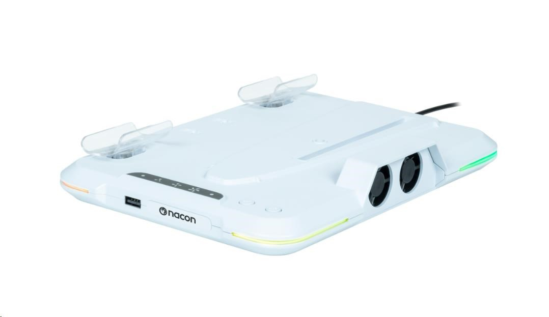 Na základni, ktorej napájanie z hernej konzoly slúži priložený USB kábel, sa nachádzajú tiež dve tlačidlá – jedno na prepínanie medzi troma prednastavenými a jednou automatickou rýchlosťou otáčania ventilátorov a druhé na výber zo štrnástich rôznych RGB efektov svetelného pruhu lemujúceho základňu.