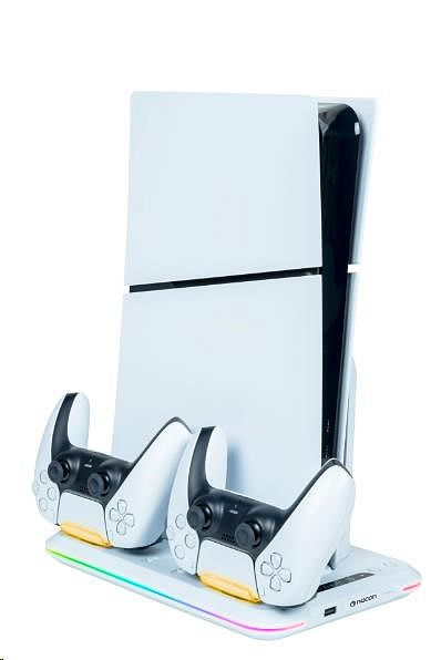 Umiestnite svoju hernú konzolu PlayStation 5 Slim na tento viacúčelový vertikálny základňa od spoločnosti Nacon. Ten je kompatibilný s diskovou aj digitálnou verziou tejto konzoly a okrem dvoch ventilátorov a jedného portu USB-A na nej nájdete aj dve kolísky slúžiace na nabíjanie herných ovládačov DualSense, pričom o stave ich nabíjania vás informuje farebné podsvietenie pod jednotlivými ovládačmi.