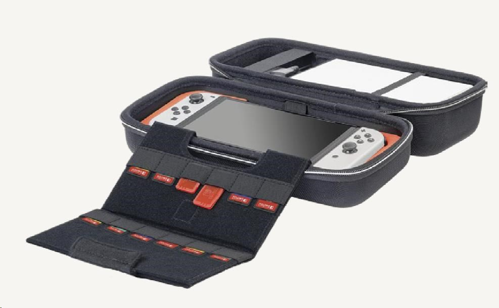 Toto väčšie prepravné puzdro od spoločnosti Nacon oceníte, ak budete chcieť bezpečne a pohodlne prenášať svoju hernú konzolu Nintendo Switch 2 vrátane jej základného príslušenstva. Puzdro pojme nielen samotnú konzolu, ale podľa potreby aj dokovaciu stanicu, nový ovládač Pro Controller alebo držiak Joy-Con 2 Charging Grip. Zároveň ponúka tiež samostatnú priehradku pre napájací adaptér s káblom a prepojovací HDMI kábel. Nastaviteľný stojan v hornej časti puzdra, pri hraní umožňujúci pohodlnejšie sledovanie diania na obrazovke, ochráni počas prepravy ako obrazovku, tak aj analógové páčky konzoly a na jeho vnútornej strane navyše nájdete dvanásť kapsičiek na uloženie herných kariet. Súčasťou balenia sú aj dve menšie plastové puzdrá na microSD karty a čistiaci handričku s logom Nintendo Switch 2. Puzdro je kompatibilné tiež s konzolami Switch a Switch – OLED Model, vrátane ich príslušenstva.