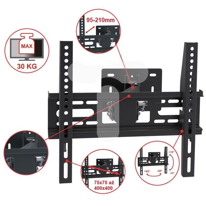 Nástenný držiak na TV Fiber Mounts FM049 Otočný +/-45°, sklopný +/-15°, výsuvný 95-240mm, VESA, nosnosť 30kg, na TV 26-55" Nástenný držiak so stredne veľkou nástennou doskou pre spoľahlivú inštaláciu na stenu s lepším rozložením hmotnosti na väčšej ploche. Držiak je vhodný na televízie s uhlopriečkou 26" až 55", televízor je možné po zavešení na tento držiak mierne otáčať do strán, naklápať a meniť vzdialenosť od steny. Oceľová konštrukcia zabezpečí bezpečné zavešenie televízorov s hmotnosťou až 30kg. Držiak je vhodný na všetky typy a značky televízorov, ktoré podporujú VESA štandard 75x75 až 400x400. Farebné prevedenie čierne. LCD LED držiak TV pre uchytenie na stenu, otočný a sklopný, mierne výsuvný, veľká inštalačná plocha Fiber moutns FM049 Technické údaje: nosnosť 30kg podpora VESA štandardu 75x75 až 400x400 vhodný na televízie s uhlopriečkou 26" až 55" výsuvný, nastaviteľná vzdialenosť od steny 95mm až 210mm naklápanie televízora hore alebo dole až o 15° otáčanie televízora do strán až o 45° (dle veľkosti TV) veľká inštalačná nástenná plocha s rozmermi 200mm x 145mm možnosť ukotvenia až na 8 hmoždiniek oceľová konštrukcia farebné prevedenie čierne záruka 2 roky Oceľový robustný držiak TV na stenu Fiber Mounts FM049 Držiak TV Fiber Mounts FM049 podporuje VESA štandardy: VESA 75x75 VESA 100x100 VESA 200x100 a 100x200 VESA 200x200 VESA 300x200 a 200x300 VESA 300x300 VESA 400x200 a 200x400 VESA 400x300 a 300x400 VESA 400x400 Nástenný držiak Fiber Mounts FM049 je vhodný na zavešenie všetkých typov aj značiek televízorov, ktoré podporujú ktorýkoľvek z vyššie uvedených VESA štandardov a ich hmotnosť nie je väčšia ako 30kg.