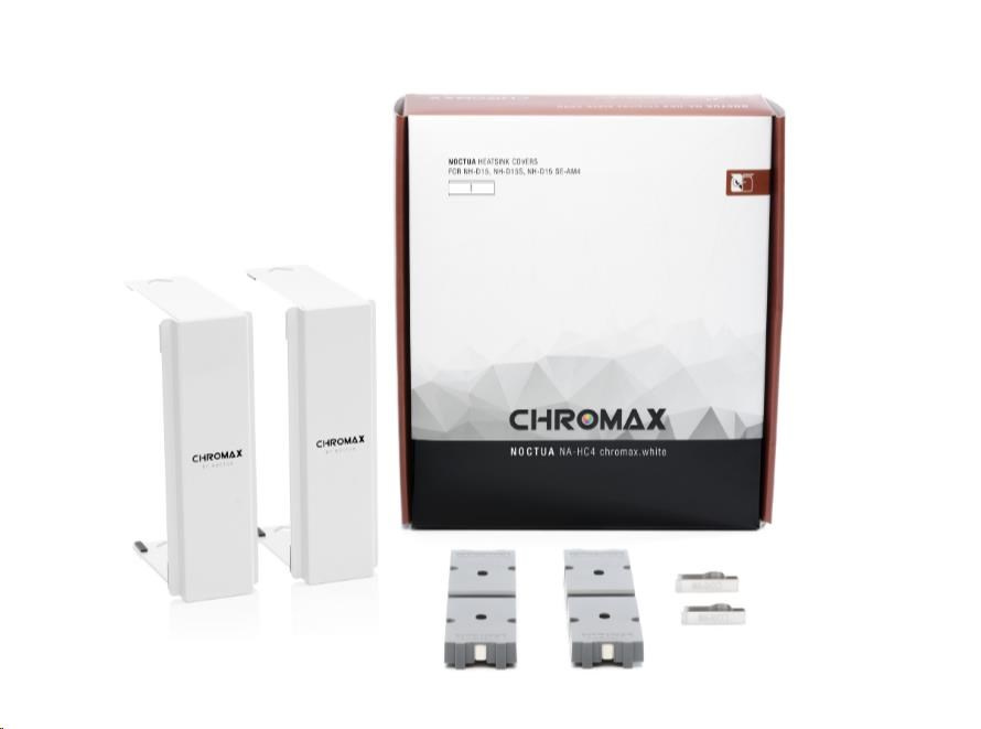 Chladičové kryty NA-HC4 chromax.white sú doplnkovým príslušenstvom k oceňovaným chladičom CPU NH-D15, NH-D15S a NH-D15 SE-AM4 od spoločnosti Noctua. Vyrobené z vysoko kvalitného hliníka s bielou práškovou povrchovou úpravou, umožňujú používateľom dať chladiču elegantný sniehobiely vzhľad, ktorý sa skvele hodí do celobielych alebo čierno-bielych zostáv. Vďaka ľahkej a priamej inštalácii trvá zmena vzhľadu chladiča NH-D15(S) iba niekoľko minút a nevyžaduje jeho demontáž z procesora. V kombinácii s ventilátormi chromax.black.swap edition NF-A15 a ich bielymi antivibračnými podložkami vám kryty NA-HC4 chromax.white dávajú možnosť premeniť váš NH-D15(S) na čierno-biely výkonný stroj, ktorý vyzerá rovnako skvele, ako chladí.