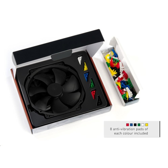 ventilátor, tichý, rozmery 140x150x25mm, prietok 140.2 m3/h, 300 až 1500 otáčok, SSO2, 4pin PWM, s vymeniteľnými farebnými antivibračnými podložkami