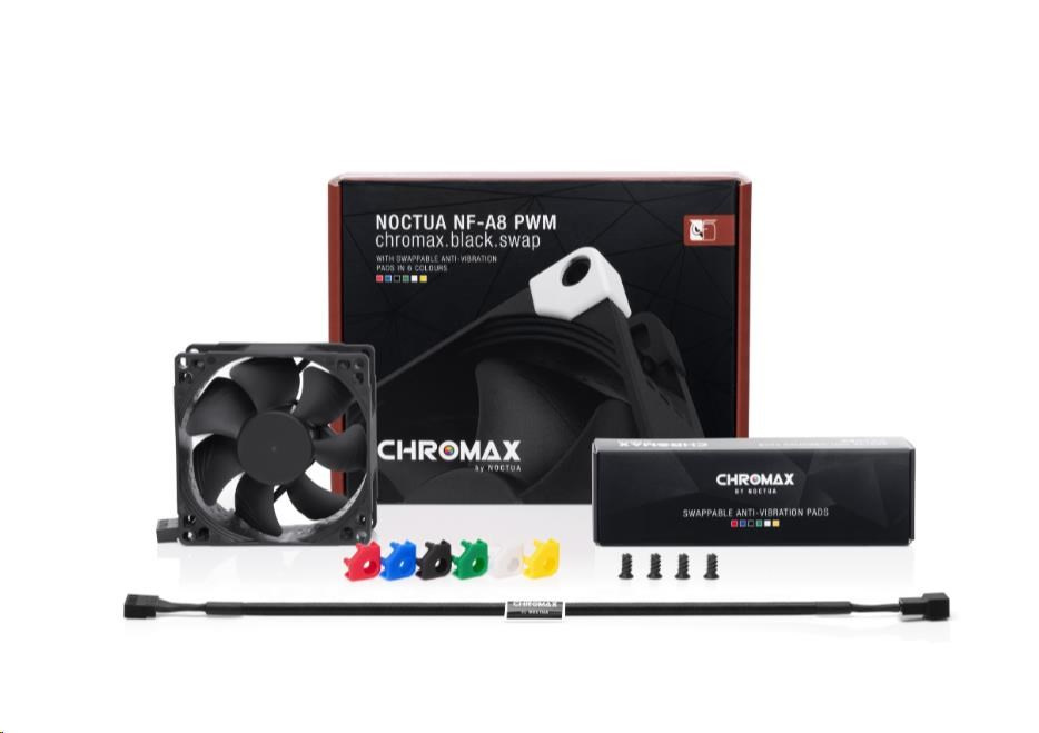 Rad NF-A8 sa zaslúžila o prednú voľbu pri výbere 80mm ventilátorov množstvom ocenení a odporúčaní od technických časopisov a stránok po celom svete. NF-A8 PWM chromax.black.swap kombinuje tichý chod tejto série a elegantný úplne čierny dizajn série chromax.black. Balenie tiež obsahuje sadu protivibračných podložiek pre tých, ktorí si radi svoj stroj farebne zladia. Kvalitu chodu a spokojnosť tiež zabezpečí SSO2 ložisko, viac ako 150000 hodín MTTF a 6 rokov záruky u výrobcu.