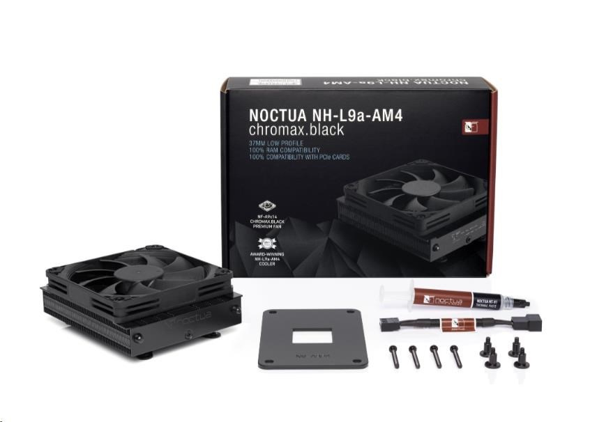 NH-L9a-AM4 chromax.black je celočierna verzia obľúbeného, vysoko kompaktného a tichého nízkoprofilového chladiča NH-L9a-AM4, navrhnutého na použitie v nízkofaktorových zostavách a HTPC prostredí. Hoci poskytuje vysoko kvalitný výkon, je nevhodný pre overclockery a odporúča sa len pre CPU/APU do 95W TDP. Navštívte stránky výrobcu, http://noctua.at/en/nh_l9a_am4_tdp_guidelines, aby ste zistili, či je tento chladič vhodný pre váš procesor.