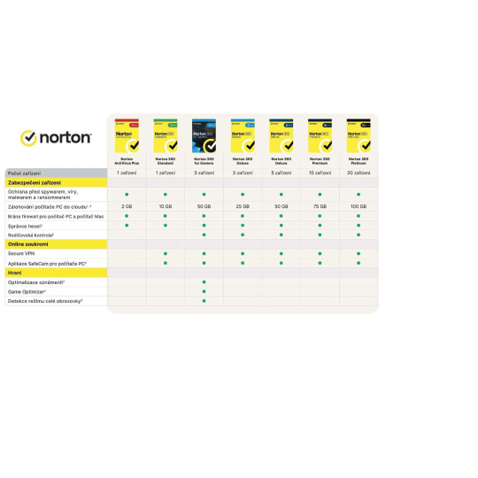 Elektronická licencia Norton 360 Deluxe poskytuje komplexnú ochranu proti škodlivému softvéru až pre 5 počítačov PC, Mac, zariadení so systémom Android alebo iOS, ako aj rodičovskú kontrolu, ktorá pomáha chrániť vaše deti online, správcu hesiel na ukladanie a správu hesiel a funkciu zálohovania z PC do cloudu. Norton 360 Deluxe obsahuje aj sieť VPN pre 5 zariadení a aplikáciu na ochranu fotoaparátu pre počítače. Určené pre nových používateľov a na obnovenie licencií existujúcich používateľov