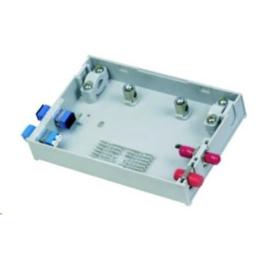 Malý plastový rozvádzač na odbočenie z hlavného vedenia. Umiestnenie 6 svoriek, 1x hlavné vedenie cez kábel, 4 výstupné porty. Výstupné porty môžu byť vybavené simplexnými adaptérmi pre ST, SC, FC a duplexné LC. Obsahuje adaptér pre pigtail káble (6 otvorov, priemer 3 mm). Rozmery: 150x104x27 mm - V cene nie sú zahrnuté optické adaptéry. - Vonkajšie rozmery: 150 x 104 x 27 mm - Vnútorný priestor: pojme zariadenie s rozmermi približne 105 x 77 x 20 mm - Pozície na ochranu zvaru: vhodné pre zvary s priemerom 3 mm - Priemer otvoru pre pigtail: 3 mm, vhodné pre štandardné prepojovacie káble..