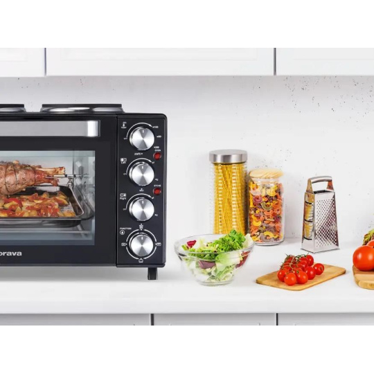 Orava Elektra-X28 elektrická trouba s dvouplotýnkou, 28 L, 2600 W, grilovací rošt, černá