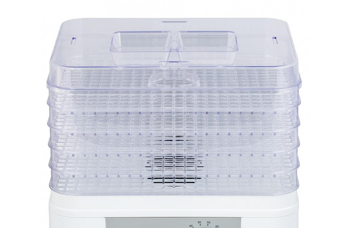 Sušička potravín s piatimi nastaviteľnými mriežkami, vysokoúčinný ohrievač a ventilátor zabezpečujú dôkladnú cirkuláciu vzduchu pre rýchle a efektívne sušenie, jednoduché ovládanie pomocou otočného ovládača teploty, rozsah nastaviteľnej teploty od 35 ° C do 70 ° C, bezpečnostná poistka, napájanie 230V ~ 50Hz, 230W, šírka: 320 mm, výška: 270 mm, hĺbka: 255 mm