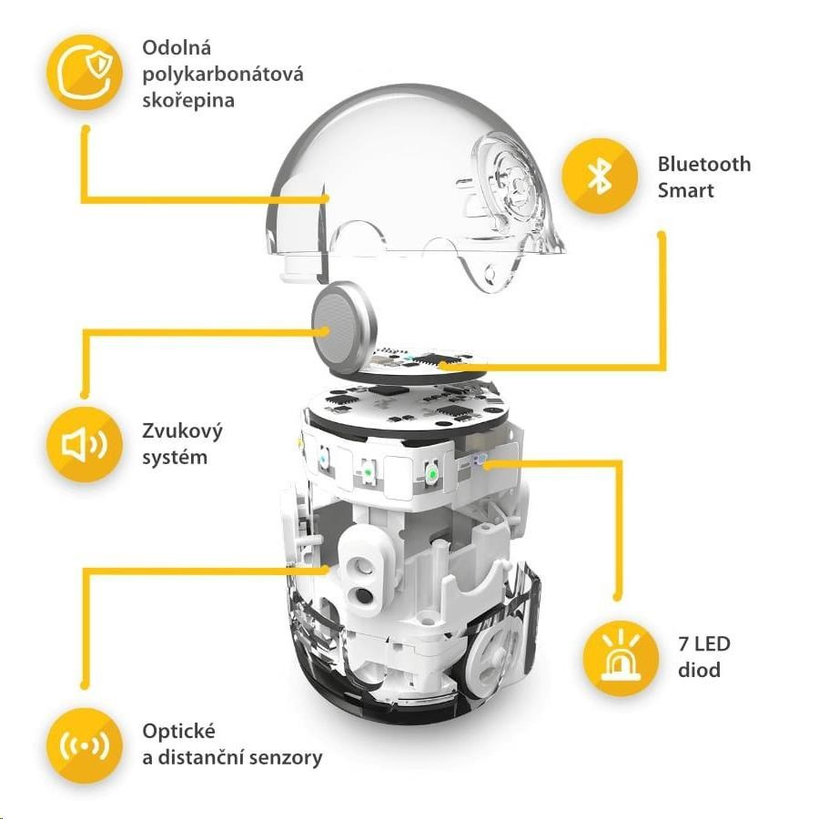 Ozobot Evo, skladacia herná plocha, ochranný skin, 4 farebné fixky, cestovné vrecúško, napájací kábel (micro USB)