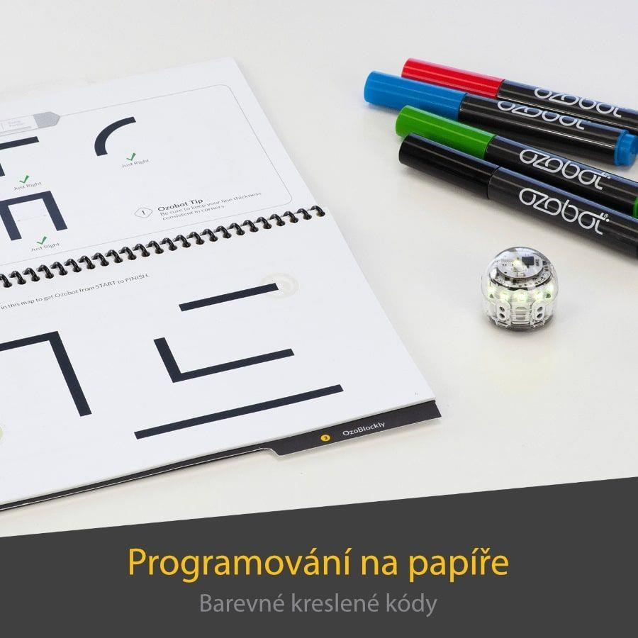 - Ani kreativita nezostane stranou – vodorovné čiary a ozokódy nakreslíte na papier a Ozobota vybavíte vlastnými kulisami a kostýmami