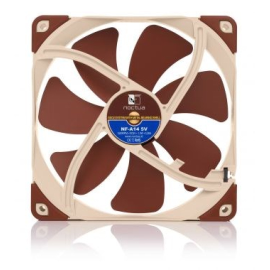 NF-A14 5V je vyhradená 5V verzia hodnoteného ventilátora Noctua prémiovej kvality NF-A14 140 mm. Vďaka štandardnému rámu AAO (Advanced Acoustic Optimization) a sofistikovaným aerodynamickým konštrukčným opatreniam, ako sú kanály zrýchlenia prietoku, je NF-A14 známym svojím vynikajúcim výkonom a tichým chodom. Technológia Smooth Commutation Drive a ložisko Noctua referenčnej triedy SSO2 zaručujú vynikajúci hladký chod a výbornú dlhodobú stabilitu. NF-A14 5V doplnený priloženým káblom napájacieho adaptéru USB, sadou adaptérů OmniJoin™ a 6-ročnou zárukou výrobcu je prémiová voľba pre náročné 5V aplikácie.