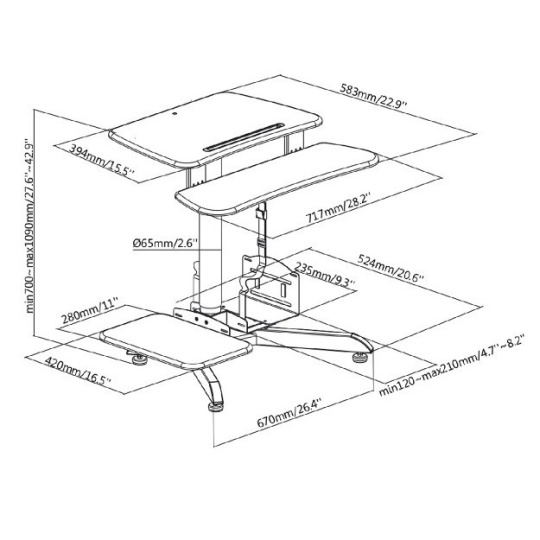 PC pracovná stanica Fiber Mounts M8C48 Pracovná stanica na PC, monitor, tlačiareň, klávesnicu a myš, nastaviteľná výška pre zmenu pozície pre prácu v sede alebo v stoje 70-109cm, nosnosť 30kg Moderná pracovná stanica s nastaviteľnou výškou pre prácu v sede alebo v stoje. Vďaka unikátnemu systému plynového pružiny veľmi jednoducho a rýchlo upravíte výšku a môžete pracovať buď v sede alebo v stoje. Pracovná stanica obsahuje dolný držiak na PC, policu na tlačiareň alebo akékoľvek príslušenstvo, vrchnú pracovnú dosku na monitor s možnosťou použitia držiakov na monitory, a policu na klávesnicu a myš. Pracovná stanica je vynikajúcej kvality, spoľahlivá konštrukcia zaručuje bezpečnosť, stabilitu a dlhú životnosť (10 a viac rokov). Farebné prevedenie čierne, záruka 3 roky. Pracovná stanica na PC, tlačiareň, klávesnicu, myš a pracovnú dosku na monitor. Výškové polohovanie pre prácu v sede alebo v stoje. Kancelárska pracovná stanica Fiber Mounts M8C48 Technické údaje: nosnosť 30kg výškové polohovanie pre prácu v sede alebo v stoje 70-109cm ľahké a rýchle nastavenie výšky vďaka plynovému pružine doska na monitor, možnosť použitia stolových držiakov na monitory polička na klávesnicu a myš, šírka 717mm spodná police na príslušenstvo - tlačiareň a pod. univerzálny držiak pre uchytenie PC toweru stabilná podstava, stojky výnimočná, veľmi pevná konštrukcia farebné prevedenie čierne záruka 3 roky Dolná policu na príslušenstvo, napr. tlačiareň a univerzálny držiak na PC tower na pracovnej stanici Fiber Mounts M8C48 Pracovná stanica Fiber Mounts M8C48 má veľmi široké spektrum využitia, od kancelárií a firiem, konferenčných miestností až po domácnosti, kde nie je miesta nazvyš. Unikátna konštrukcia s plynovou pružinou umožňuje kedykoľvek veľmi rýchlo zmeniť pracovnú výšku pre prácu v sede alebo v stoje. Horná doska na monitor je vhodná aj na použitie stolových držiakov na monitory - monitor môžete mať voľne položený na podstavci alebo uchytený na držiaku.