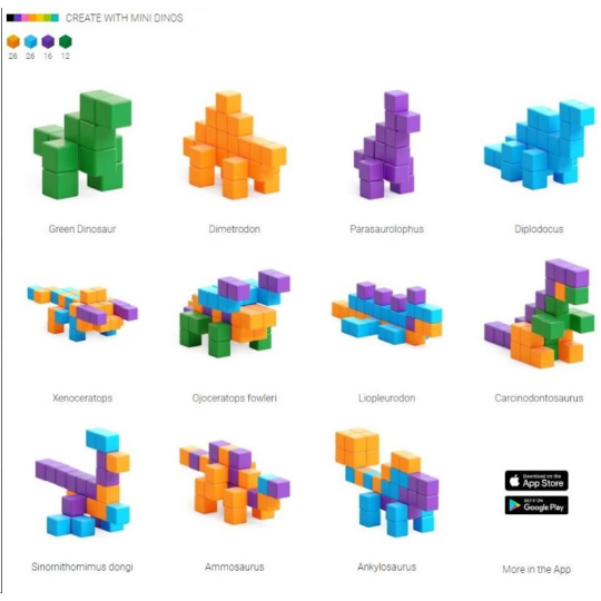 Séria PIXIO Mini Dinos obsahuje 80 blokov PIXIO v 4 farbách. Oživte svoje kreatívne nápady a