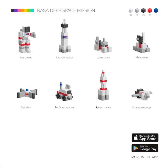 Stavebnica PIXIO 31101 NASA Deep Space Mission (Vesmírna misia) obsahuje 214 kociek PIXIO v 5 farbách. Umožnia oživiť vaše kreatívne nápady a prinesú farebnú radosť do života. Začnite stavbou jednoduchých modelov podľa pokynov a potom, až budete pripravení, prejdite k vytváraniu vlastných návrhov. S touto sadou si môžete postaviť astronauta, lunárny rover, raketu, satelit, teleskop a mnoho ďalších. Pixio je splnený sen fanúšikov Pixel Artu, hráčov Minecraftu a všetkých, ktorí sa radi hrajú. Použite ho ako učebný zdroj na rozvoj detskej kreativity. Obsahuje 5 farieb, ktoré vám pomôžu premeniť jednoduché tvary na skvelé objekty a postavy (biela 128x, sivá 46x, čierna 20x, červená 19x, modrá 1x).