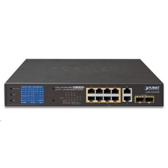 Planet GSD-1222VHP Switch, 8x PoE + 2x 1000Base-T + 2x SFP, LCD,VLAN, extend mód 10Mb do 250m, IEEE 802.3at 120W