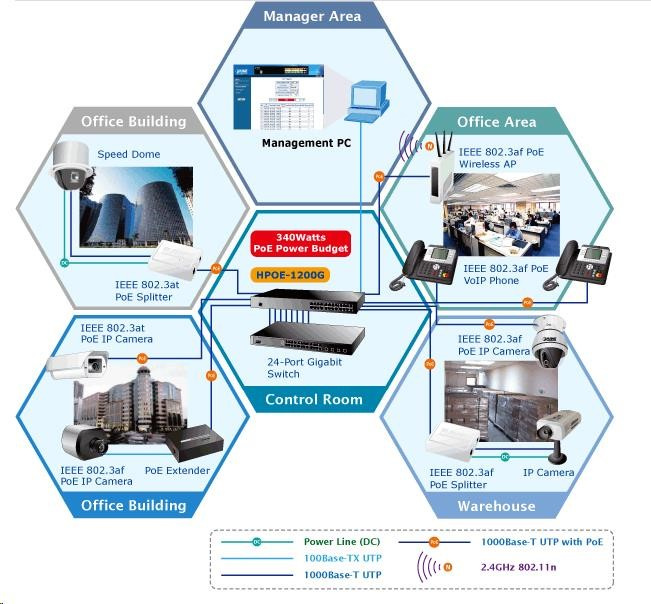 PoE (napájanie cez ethernet) Injektor HUB na napájanie zariadení cez ethernet podľa IEEE 802.3af a IEEE 802.3at. Je určený na napájanie zariadení, ako sú IP kamery PTZ alebo Speedome, prístupové body WiFi alebo telefóny VoIP. K dispozícii je celkovo 12 portov s celkovým výstupným výkonom 340 W, injektor je priechodný, napájací zdroj sa pripája k existujúcej ethernetovej linke Cat5/5e/6. Ak koncové zariadenie nepodporuje IEEE802.3at budete potrebovať POE-161S na zabezpečenie napájania vzdialeného zariadenia pre túto káblovú trasu. Vlastnosti: - 12 portov/injektorov 802.3at, in-line mid-span, (12 portov RJ-45 data-in, 12 portov data+power out) - IEEE 802.3, 802.3u, 802.3ab 1000Base-T - IEEE 802.3af, IEEE 802.3at, 52 V DC PoE (napájanie cez ethernet) - každý port plne napájaný - maximálna celková spotreba pripojených zariadení PoE 340 W - automatická detekcia napájania na každom porte - ochrana portov proti skratu a vzájomnému rušeniu - WEB správa zariadení - napájanie zariadení: 230 V AC, spotreba do 370 W - aktívne chladenie: 2 ventilátory - rozmery: 440 x 300 x 44 mm, 1U/19" - hmotnosť: 4,27 kg..