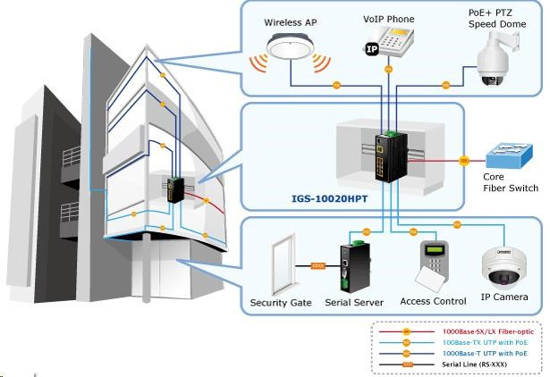 Planet IGS-10020HPT PoE switch 8x 1000Base-T, 2x SFP, 802.3at 270W, IP30, -40 až 75°C, SNMP, IGMPv3, IPv6 Inteligentné prepínače pre priemyselný Ethernet sú určené do náročných prevádzkových podmienok so širokým rozsahom prevádzkových teplôt, neistým napájaním a častými otrasmi. Zároveň poskytujú vynikajúce možnosti viacnásobného prepojenia na dosiahnutie robustného prepojenia systému s veľmi nízkym časom obnovy. IGS-10020HPT je vybavený pre redundanciu okrem známej metódy Spanning Tree (ktorej čas obnovy sa pohybuje v sekundách) najmä špecializovanou funkciou "Redundant ring", ktorá má čas obnovy a nájdenia novej cesty do 300 ms. Ako prepínač PoE môže priamo napájať až 8 zariadení IEEE 802.3at, a preto je ideálny pre aplikácie so zníženou dostupnosťou energie. Prepínače radu IGS sa ľahko inštalujú na štandardnú lištu DIN alebo priamo na stenu a umožňujú nasadenie známej technológie Ethernet aj v priemyselnom prostredí. Sú vhodné aj na inštaláciu vo vonkajších krytoch s veľkými výkyvmi prevádzkových teplôt (typicky bezdrôtové aplikácie a aplikácie MAN ISP). Vlastnosti: - 8 portov 1000Base-T, prepínanie, plný duplex (1000/2000 Mb/s), automatické vyjednávanie (10/100/1000 Mb/s), automatická detekcia priameho/krížového kábla na každom porte - pre všetky PoE IEEE 802.3at injektory so zaťažiteľnosťou 30 W/port, spolu až 270 W - 2 porty SFP na inštaláciu modulov 1000Base-SX/LX/BX alebo 100Base-FX - Priepustnosť: zbernica 20 Gb/s, 14,8 Mp/s (64B) - Podpora Jumbo Frame do 9 kB, 8k MAC adries, 4Mbitová vyrovnávacia pamäť - 255 VLAN IEEE 802.1Q, siete založené na MAC alebo protokole VLAN, VoIP VLAN - port trunking IEEE 802.3ad LACP - IGMP v1,v2,v3 až do 256 multicast skupín, režim IGMP querier - 8-úrovňová prioritizácia prevádzky QoS podľa portov, DSCP/ToS, 802.1p alebo 802.1Q tagy - podpora Spanning Tree IEEE 802.1d, Rapid Spanning Tree IEEE 802.1w - IP/MAC ACL (access control list) do 123 pravidel, MAC/IP binding - DHCP snooping - port shaper - administrace Web/SNMPv3 s podporou zabezpečeného přenosu SSH/SSL - podpora IPv4/IPv6 - PoE scheduler pro možnost zapínání/vypínaní napájení podle časového plánu - pole LED indikátorů pro diagnostiku provozu - instalace na DIN lištu, montážní díl součástí - instalace na zeď, montážní díl součástí - krytí IP30 - napájení: 48V DC redundantní, připojení možné ze dvou různých zdrojů (nejsou součástí balení); vlastní příkon do 30W - ochrana proti přepólování, připojení napájení na svorkovnici, umístění na spodním panelu (nepřekáží při montáži na zeď) - přepěťová ochrana napájení do 6kV proti napěťovým špičkám (EFT) - přepěťová ochrana LAN portů do 6kV proti elektrostatickému náboji (ESD) - spínací poplachové relé (24V/1A) při výpadku primárního napájení - zařízení je odolné proti pádu (IEC-60068-2-32) z výšky 7.