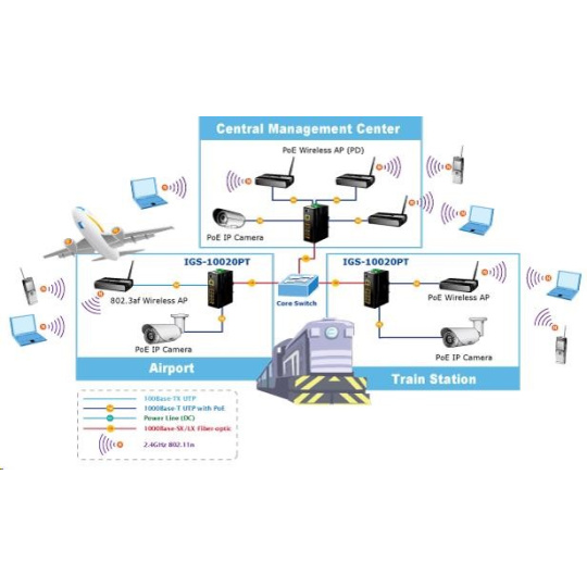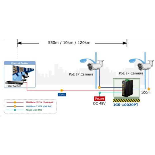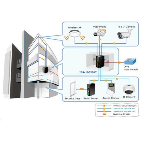 Planet IGS-10020PT PoE switch 8x 1000Base-T, 2x SFP, 802.3af 130W, IP30, -40 až 75°C, SNMP, IGMPv3, IPv6 Inteligentné prepínače pre priemyselný Ethernet sú určené do náročných prevádzkových podmienok so širokým rozsahom prevádzkových teplôt, neistým napájaním a častými otrasmi. Zároveň poskytujú vynikajúce možnosti viacnásobného prepojenia na dosiahnutie robustného prepojenia systému s veľmi nízkym časom obnovy. IGS-10020PT je vybavený pre redundanciu okrem známej metódy Spanning Tree (ktorej čas obnovy sa pohybuje v sekundách) najmä špecializovanou funkciou "Redundant ring", ktorá má čas obnovy a nájdenia novej cesty do 300 ms. Ako prepínač PoE môže priamo napájať až 8 zariadení IEEE 802.3af, takže je ideálny pre aplikácie s nedostatkom energie. Prepínače radu IGS sa ľahko inštalujú na štandardnú lištu DIN alebo priamo na stenu a umožňujú nasadenie známej technológie Ethernet aj v priemyselnom prostredí. Sú vhodné aj na inštaláciu vo vonkajších krytoch s veľkými výkyvmi prevádzkových teplôt (typicky bezdrôtové aplikácie a aplikácie MAN ISP). Vlastnosti: - 8 portov 1000Base-T, prepínanie, plný duplex (1000/2000 Mb/s), automatické vyjednávanie (10/100/1000 Mb/s), automatická detekcia priameho/krížového kábla na každom porte - pre všetky PoE IEEE 802.3af injektory so zaťažiteľnosťou 15,4 W/port, spolu až 130 W - 2 porty SFP na inštaláciu modulov 1000Base-SX/LX/BX alebo 100Base-FX - Priepustnosť: zbernica 20 Gb/s, prevádzková: 14,8 Mp/s (64B) - Podpora Jumbo Frame až 9 kB, 8k MAC adries, 4Mbitová vyrovnávacia pamäť - 255 VLAN IEEE 802.1Q, siete založené na MAC alebo protokole VLAN, VoIP VLAN - port trunking IEEE 802.3ad LACP - IGMP v1,v2,v3 až do 256 multicast skupín, režim IGMP querier - 8-úrovňová prioritizácia prevádzky QoS podľa portov, DSCP/ToS, 802.1p alebo 802.1Q tagy - podpora Spanning Tree IEEE 802.1d, Rapid Spanning Tree IEEE 802.1w - IP/MAC ACL (access control list) do 123 pravidel, MAC/IP binding - DHCP snooping - port shaper - administrace Web/SNMPv3 s podporou zabezpečeného přenosu SSH/SSL - podpora IPv4/IPv6 - PoE scheduler pro možnost zapínání/vypínaní napájení podle časového plánu - pole LED indikátorů pro diagnostiku provozu - instalace na DIN lištu, montážní díl součástí - instalace na zeď, montážní díl součástí - krytí IP30 - napájení: 48V DC redundantní, připojení možné ze dvou různých zdrojů (nejsou součástí balení); vlastní příkon do 30W - ochrana proti přepólování, připojení napájení na svorkovnici, umístění na spodním panelu (nepřekáží při montáži na zeď) - přepěťová ochrana napájení do 6kV proti napěťovým špičkám (EFT) - přepěťová ochrana LAN portů do 6kV proti elektrostatickému náboji (ESD) - spínací poplachové relé (24V/1A) při výpadku primárního napájení - zařízení je odolné proti pádu (IEC-60068-2-32) z výšky 7.