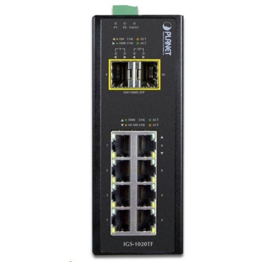 Planet IGS-1020TF, Switch, průmyslový, 8x 10/100/1000T, 2x 100/1000X SFP, -40~+75°C