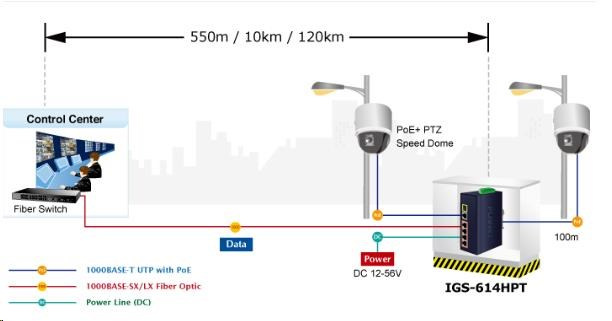 Planet IGS-614HPT, PoE switch, 5x 1000Base-T, 1x SFP, 4x PoE 802.3at, -40~+75°C, 12-56VDC, dual-power, DIN