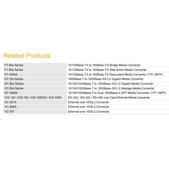 - PLANET Fast Ethernet, Gigabit Ethernet Media Converter série: FT-80x / FT-90x / FT-1205A a GT-70x / GT-80x / GT-90x / GT-1205A
