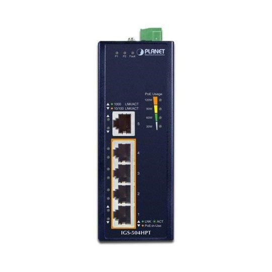 Planet switch IGS-504HPT, průmysl.verze 5xGbE, DIN, 4xPoE+, IP40, -40 až 75°C, 12-56V