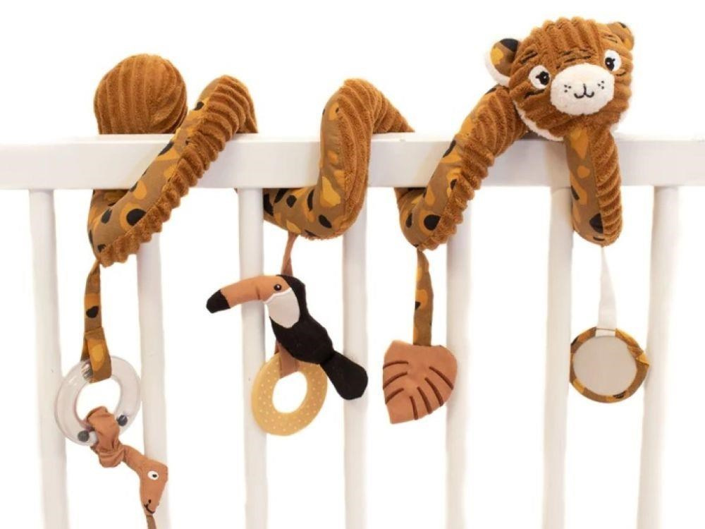 Originálna špirála na postieľku, na kočík alebo na hrazdičku, v podobe roztomilého tigra upúta pozornosť každého bábätka. Úžasne hebká špirála s chrastítkom, zrkadielkom, hryzátkom aj šuštiacim lístkom stimuluje detské zmysly, rozvíja jemnú motoriku a koordináciu očí a rúk. Prezrite si originálnu špirálu, ktorá vykúzli úsmev na tvári deťom aj rodičom.