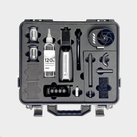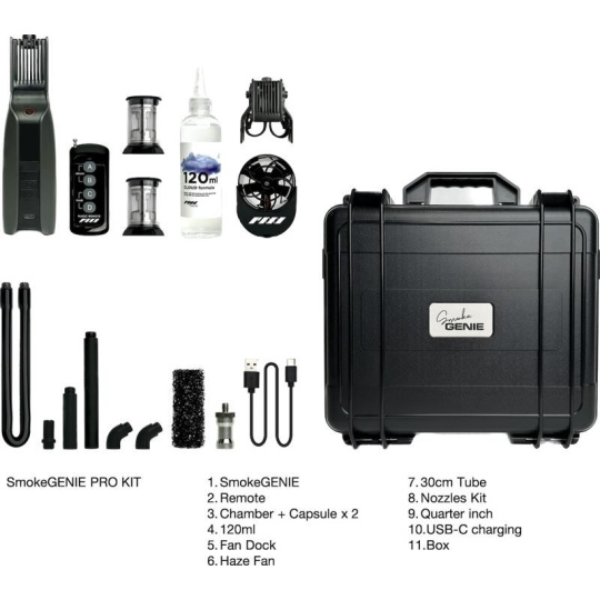 Okrem zariadenia SmokeGENIE obsahuje profesionálna sada bezdrôtový diaľkový ovládač, dve vymeniteľné dymové komory, adaptér pre filmový mľžny ventilátor, štyri presné trysky na tvarovanie dymu, trysku pre tekutý dym a 12" silikonovú predlžovaciu trubicu. Súčasťou balenia je kvapalina Cloud Formula, s ktorou môžete ihneď začať vytvárať dym. Súčasťou balenia sú tri li-ion batérie 18650 a 23A batérie na napájanie zariadenia SmokeGENIE a diaľkového ovládania. Vďaka priloženému ochrannému pevnosťou puzdru budete mať zariadenie SmokeGENIE a príslušenstvo pri cestovaní v bezpečí.
