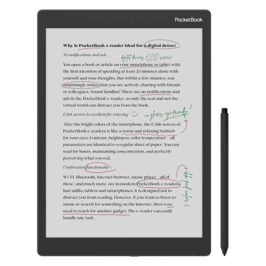 Veľký 10,3” farebný displej E Ink Kaleido™ 3, založený na technológii Mobius™, je maximálne šetrný k očiam. Neoslňuje a poskytuje dostatok priestoru pre pohodlné písanie a čítanie.