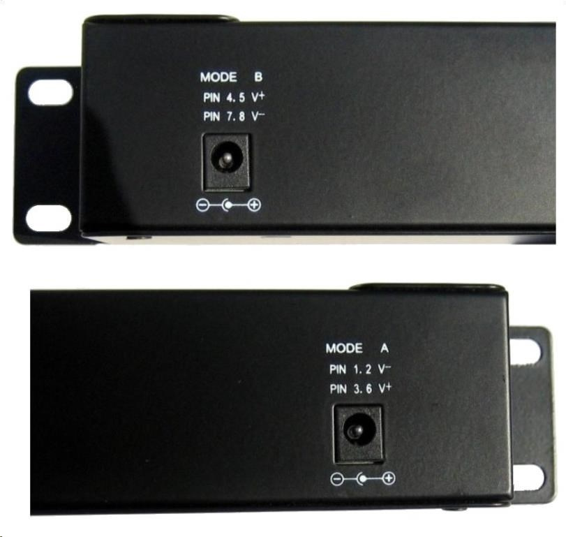 Vstup pre napájanie cez dva 2,1 mm 60V jacky, všetkých 12 portov je napájaných vždy z oboch vstupov súčasne v režime podľa zvoleného A/B vstupu:
