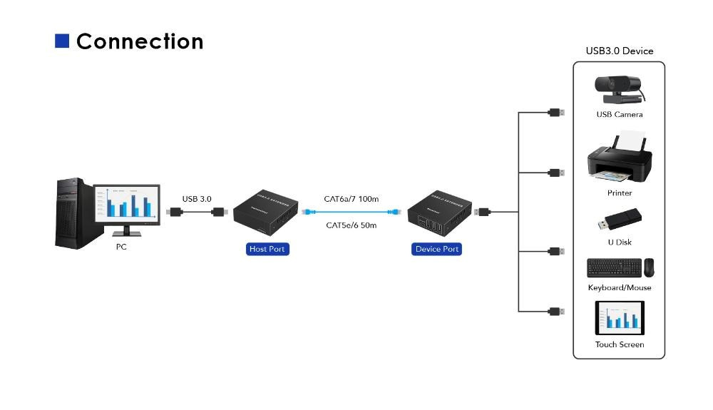 Tento extender prekračuje limity maximálnej vzdialenosti USB kábla a umožňuje pripojiť všetky USB periférie na vzdialenosť až 100 m pomocou kábla Cat5e/Cat6/Cat6A.