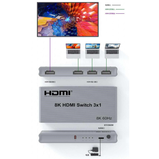 3 HDMI zariadenia na vstupe zdieľajú 1 výstupný monitor, projektor. Výber vstupných zariadení: 1.automaticky, 2.stlačením tlačidla na čele prepínača, 3.diaľkovým ovládačom
