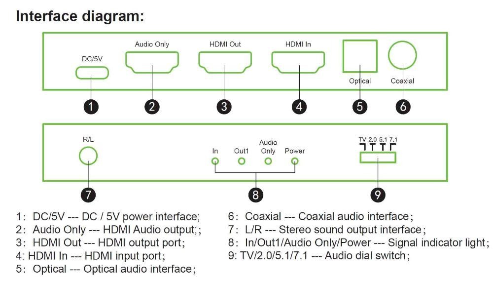 Extraktor umožňuje oddeliť audio signál z HDMI vstupu na analógový alebo digitálny výstup, ktorý je vyvedený na konektory: StereoJack 3,5mm, Digitálne audio RCA CINCH, Digitálny optický TOSLINK (SPDIF) alebo HDMI vyhradený pre audio výstup.