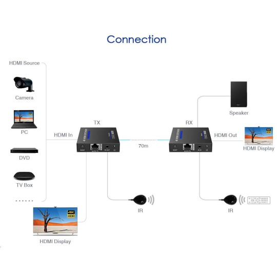 Toto zariadenie HDMI Extender umožňuje prenášať signál HDMI na veľké vzdialenosti pomocou sieťového kábla CAT6/6A/7.