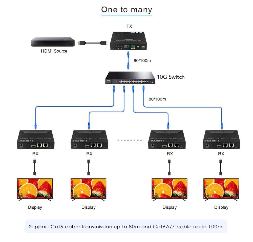 Zariadenie umožňuje po jednom sieťovom kábli alebo prostredníctvom 10G LAN siete preniesť nekomprimovaný 4K@60Hz HDMI signál s extrémne malým oneskorením a v špičkovej kvalite až na 80m a súčasne IR signály, RS232 a digitálny zvuk.