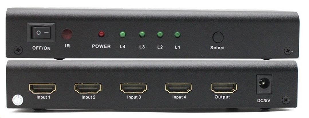 4 zariadenia HDMI zdieľajú 1 výstupné zariadenie HDMI (obrazovku). Výber zariadenia pomocou tlačidla alebo diaľkového ovládania.Zvukový výstup pre zosilňovač alebo audio systém.
