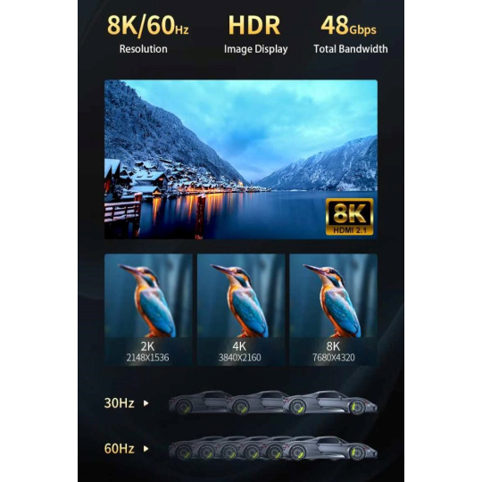 - HDMI 2.1 Ultra High Speed aktivní optický fiber kabel, podporuje HDMI2.1 nebo nižší HDMI2.0 a HDMI1.4