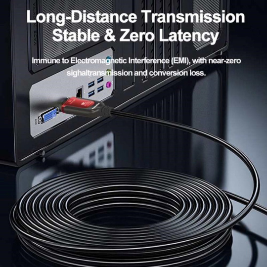 - Optický AOC kabel se vyznačuje vynikajícím přenosem signálu na velké vzdálenosti beze ztrát, je odolný proti elektromagnetickému rušení a dává nejlepší možný obraz ve srovnání s metalickými kabely