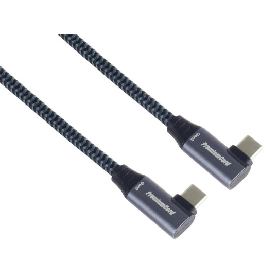 PremiumCord USB-C 2x zahnutý 90° kábel ( USB 3.2 GEN 2x2, 5A, 100W, 20Gbit/s ) hliníkové krytky konektorov, bavlnený opletenie, 3m