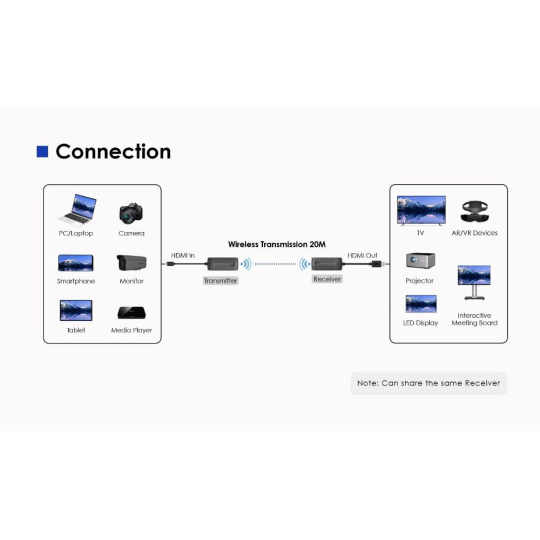 - Podporuje bezdrôtový prenos rozlíšenia 4K@60Hz a Full HD 1080p na vzdialenosť až 20m