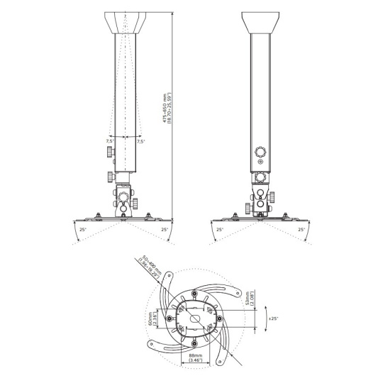 Profesionálny dizajnový stropný držiak na projektor EDBAK PMV100    Stropný držiak na zavesenie projektora s hmotnosťou do 15kg, najvyššia kvalita, dizajn, nastaviteľnosť 45-65cm    Nie vždy je možné použiť obyčajný stropný držiak na projektory, niekedy je potrebné použiť držiaky najvyššej kvality a krásneho dizajnu. My vám takéto držiaky na projektory ponúkame. Komplexná rada profesionálnych stropných držiakov na projektory v nádhernom dizajnovom prevedení. Držiaky sú úplne nastaviteľné, vhodné pre 99% dostupných projektorov a dataprojektorov. Farba čierna alebo biela. Záruka 5 rokov. Ak vám záleží na dizajne rovnako ako na kvalite, ste na správnej stránke.  Profesionálny dĺžkovo nastaviteľný otáčací a sklopný stropný držiak na projektory Edbak PMV100  Technické údaje:  nosnosť 15kg univerzálny držiak na uchytenie 99% dostupných projektorov na projektory s 3 alebo 4 otvormi pre uchytenie rozteč otvorov pre uchytenie v rozmedzí 50-490mm dĺžkové nastavenie 450mm až 650mm otáčanie do strán +/- 360° náklon do strán +/- 25° náklon nahor a nadol +/- 25° korekcia roviny obrazu korekcia nerovnosti stropu +/- 7,5° zaistenie v požadovanej polohe systém pre skryté vedenie káblov najvyššia kvalita - profesionálne prevedenie nádherný dizajn biele alebo čierne prevedenie záruka 5 rokov Stropné a nástenné držiaky na projektory najvyššej kvality, profesionálne Edbak PMV100  Na stropný držiak s nastavením dľžky 45-65cm EDBAK PMV100 je možné uchytiť všetky projektory, ktoré majú 3 alebo 4 otvory so závitom s roztečou 50mm až 490mm.  Profesionálne stropné alebo nástenné držiaky na projektory Edbak PMV100  Vďaka najvyššej kvalite a profesionálnemu prevedeniu sú držiaky EDBAK rady PMV vhodné naozaj kamkoľvek.