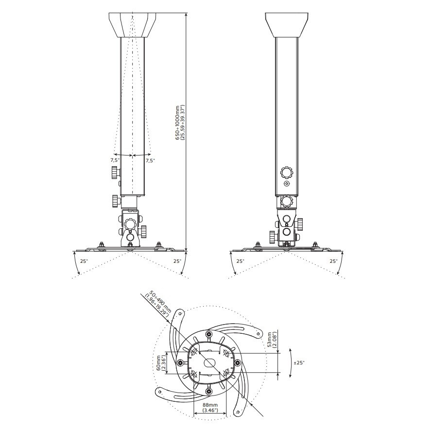 Profesionálny dizajnový stropný držiak na projektor EDBAK PMV200 Stropný držiak na zavešenie projektora s hmotnosťou do 15kg, najvyššia kvalita, dizajn, nastaviteľnosť 65-100cm Nie vždy je možné použiť obyčajný stropný držiak na projektory, niekedy je potrebné použiť držiaky najvyššej kvality a krásneho dizajnu. My Vám takové držiaky na projektory ponúkame. Komplexná séria profesionálnych stropných držiakov na projektory v nádhernom dizajnovom prevedení. Držiaky sú plne nastaviteľné, vhodné pre 99% dostupných projektorov a dataprojektorov. Farebné prevedenie čierne alebo biele. Záruka 5 rokov. Ak Vám záleží na dizajne rovnako ako na kvalite, ste na správnej stránke. Držiaky na projektory najvyššej kvality, rôzne dĺžkové nastavenie, otáčanie, sklápanie, vedenie káblov Edbak PMV200 Technické údaje: nosnosť 15kg univerzálny držiak pre uchytenie 99% dostupných projektorov na projektory s 3 alebo 4 otvormi na uchytenie rozstup otvorov pre uchytenie v rozmedzí 50-490mm dĺžkové nastavenie 650mm až 1000mm otáčanie do strán +/- 360° sklápanie do strán +/- 25° sklápanie nahor a nadol +/- 25° korekcia roviny obrazu korekcia nerovností stropu +/- 7,5° zabezpečenie v požadovanej pozícii systém pre skryté vedenie káblov najvyššia kvalita - profesionálne prevedenie nádherný dizajn biele alebo čierne prevedenie záruka 5 rokov Edbak PMV200 Na stropný držiak s nastaviteľnou dĺžkou 65-100cm EDBAK PMV200 je možné uchytiť všetky projektory, ktoré majú 3 alebo 4 otvory so závitom s rozstupom 50mm až 490mm. Vďaka najvyššej kvalite a profesionálnemu prevedeniu sú držiaky EDBAK rady PMV vhodné naozaj kamkoľvek.
